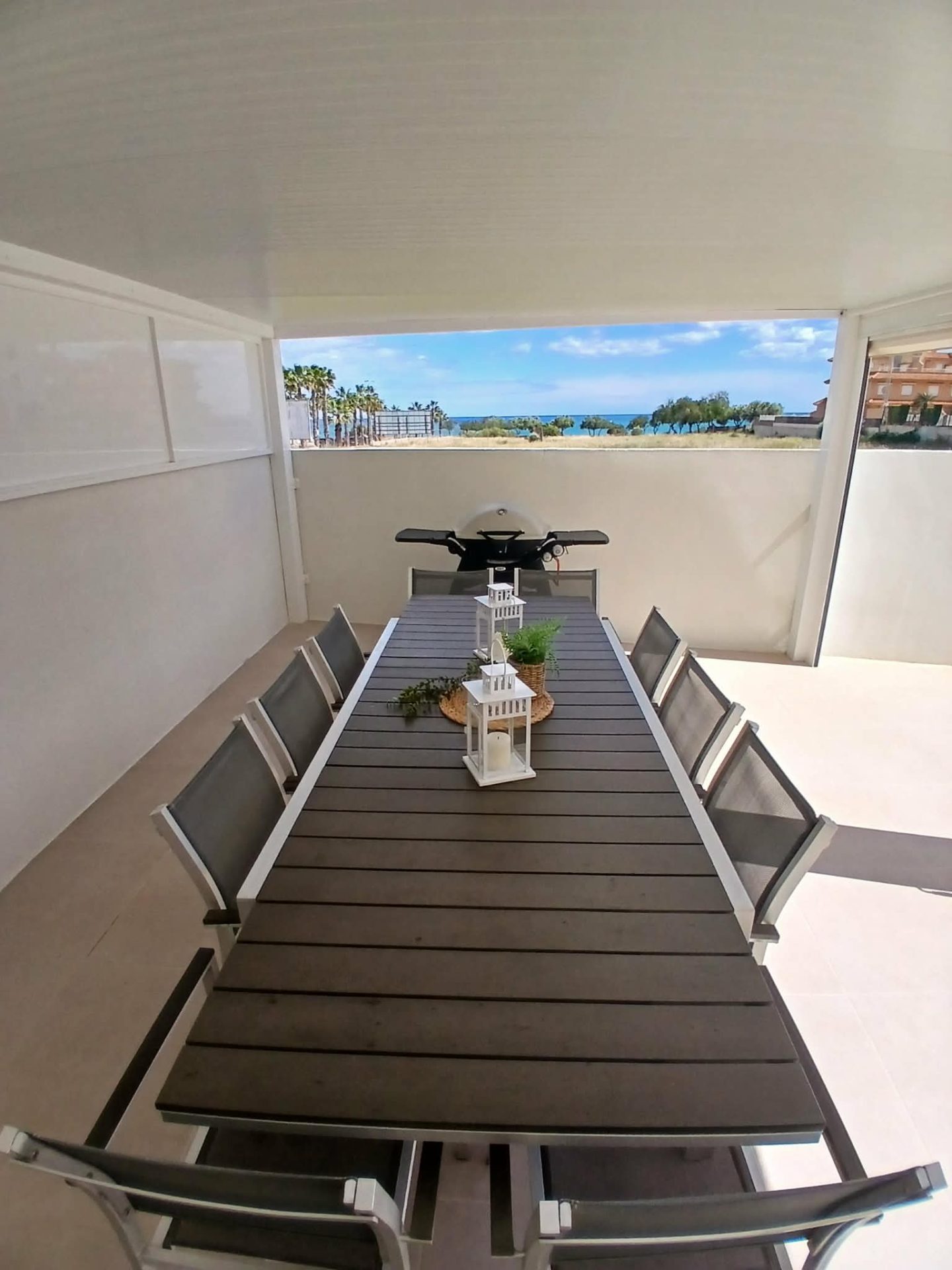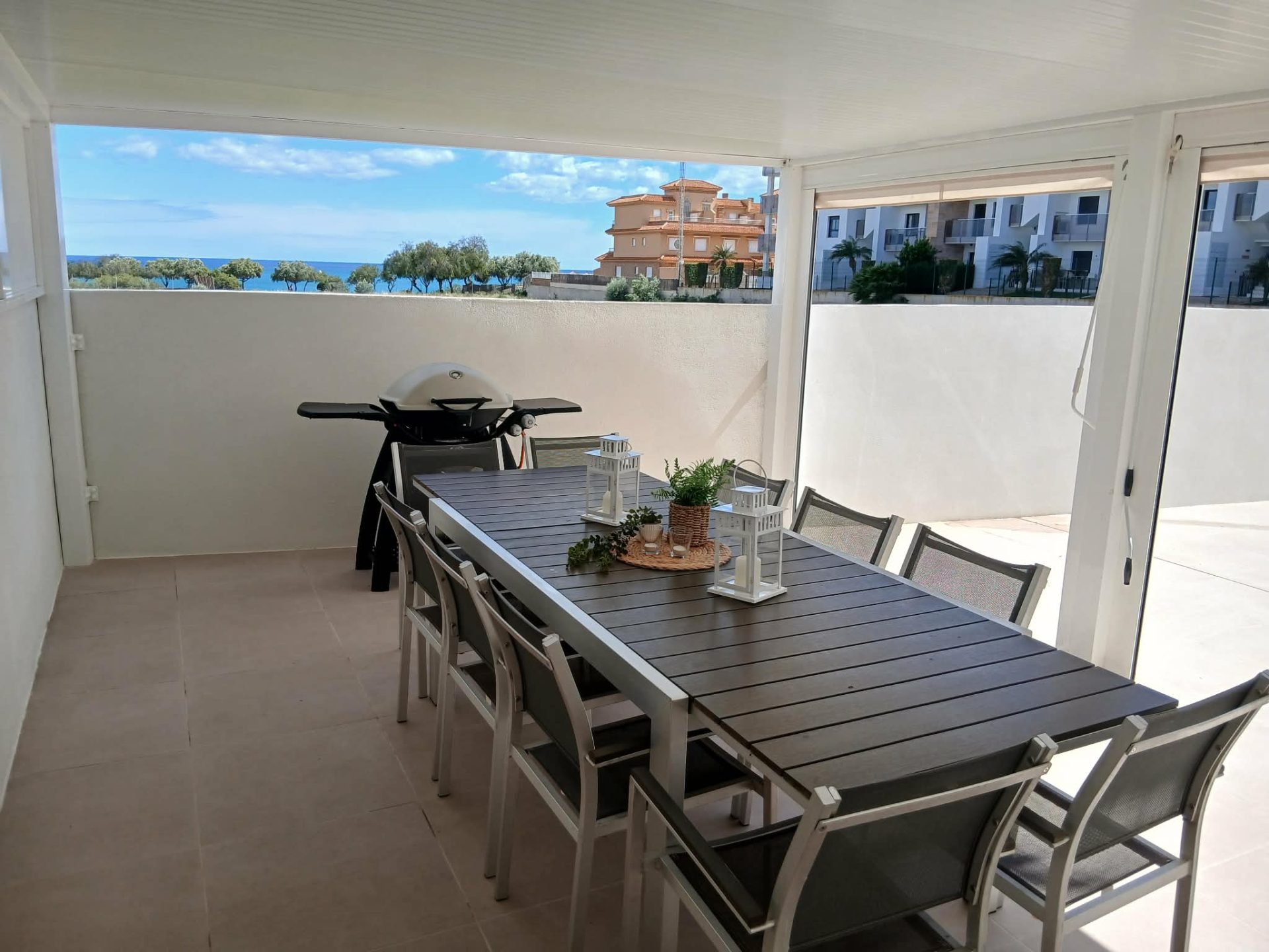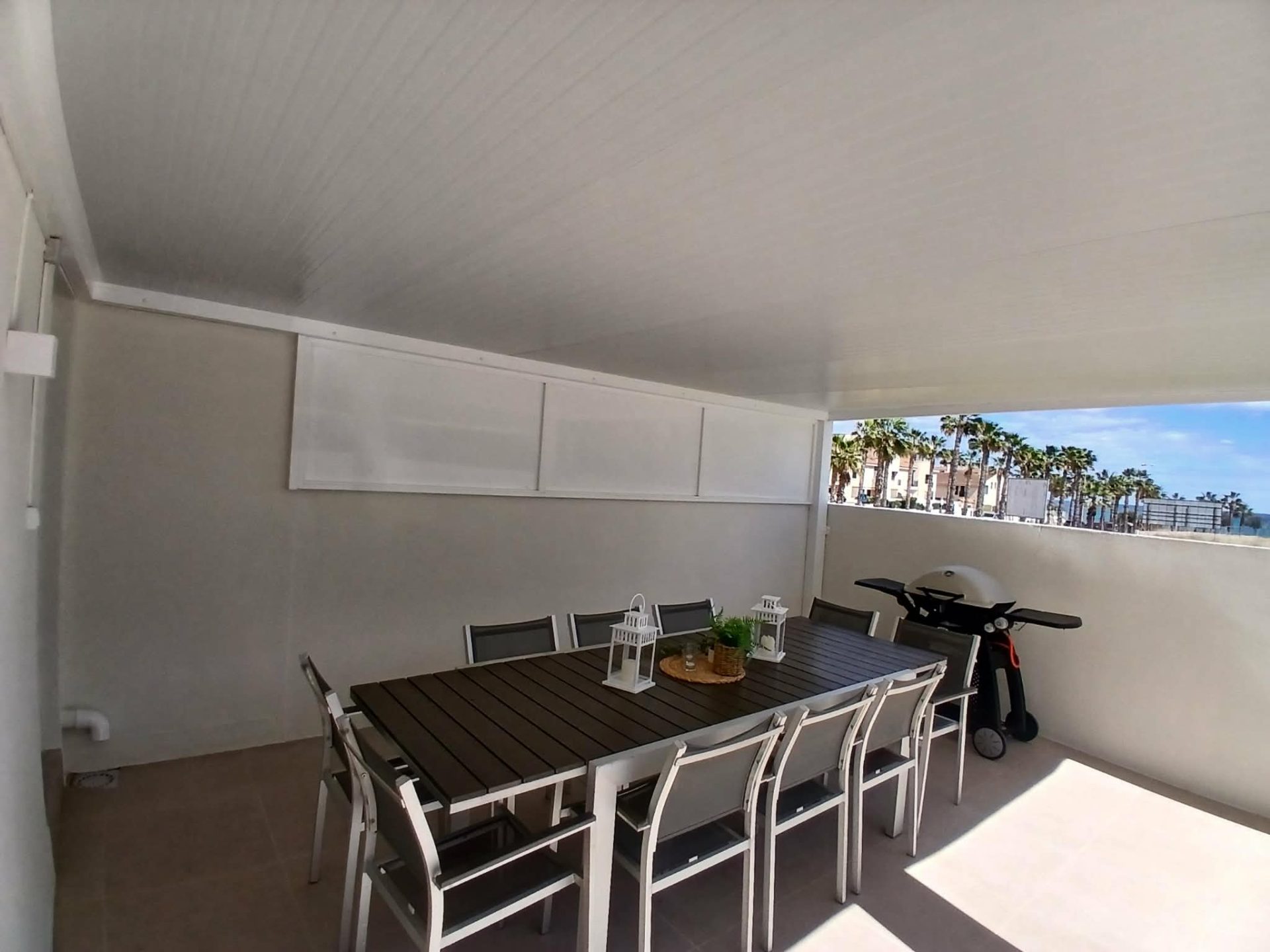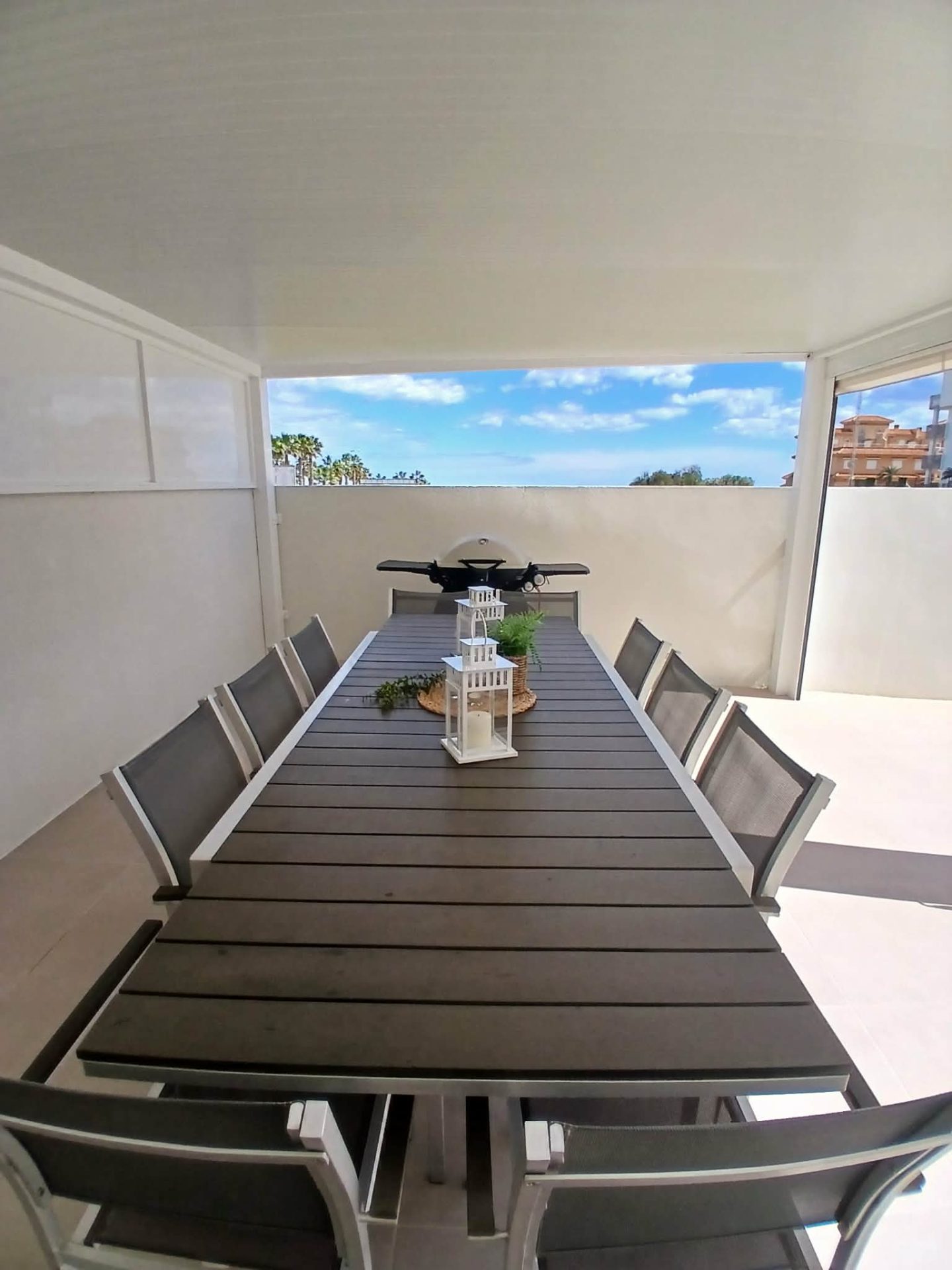 Þar er stækkanlegt borð, 8 stólar, 6 sólbekkir og frábær aðstaða til að njóta blíðunnar á Spáni, grilla góðan mat og sóla sig. Á annarri hæð eru suðursvalir út frá svefnherbergi með útsýni til sjávar og einnig litlar austursvalir með sjávarsýn frá ganginum.