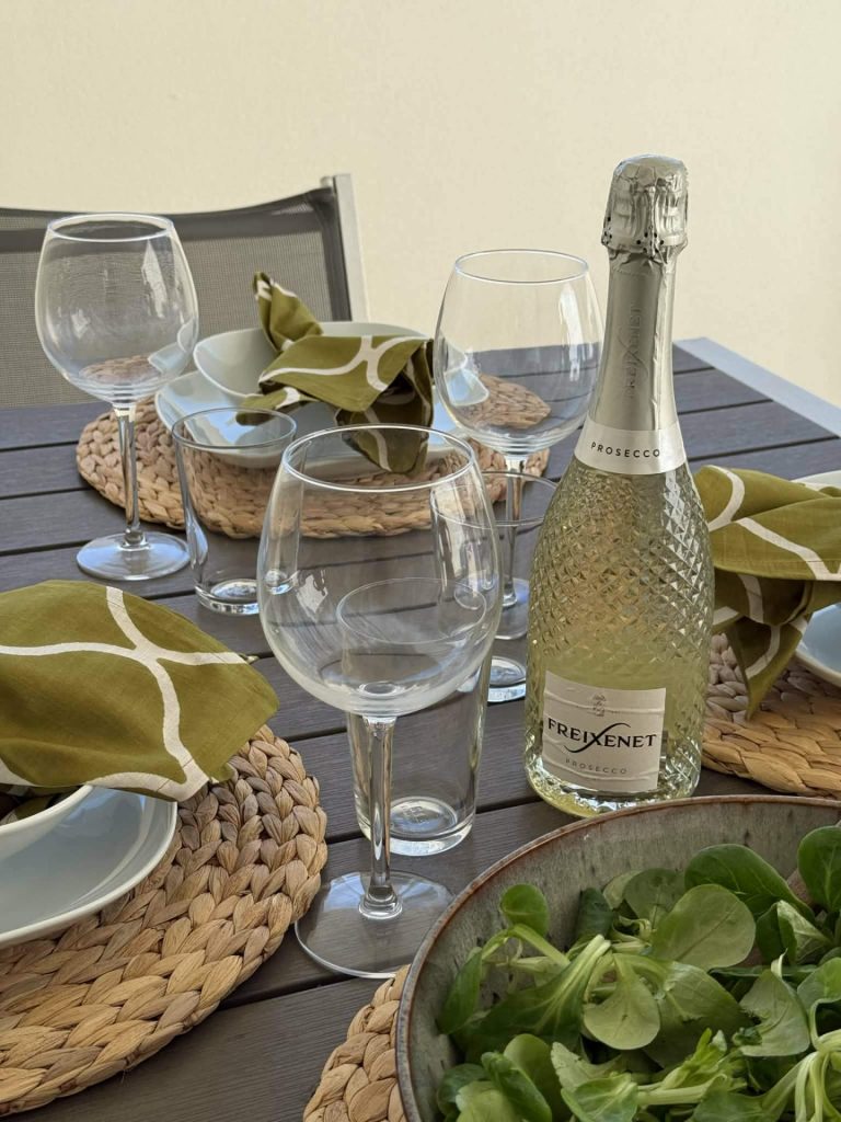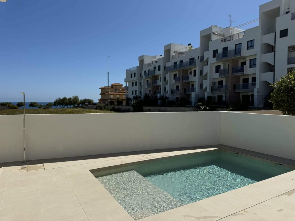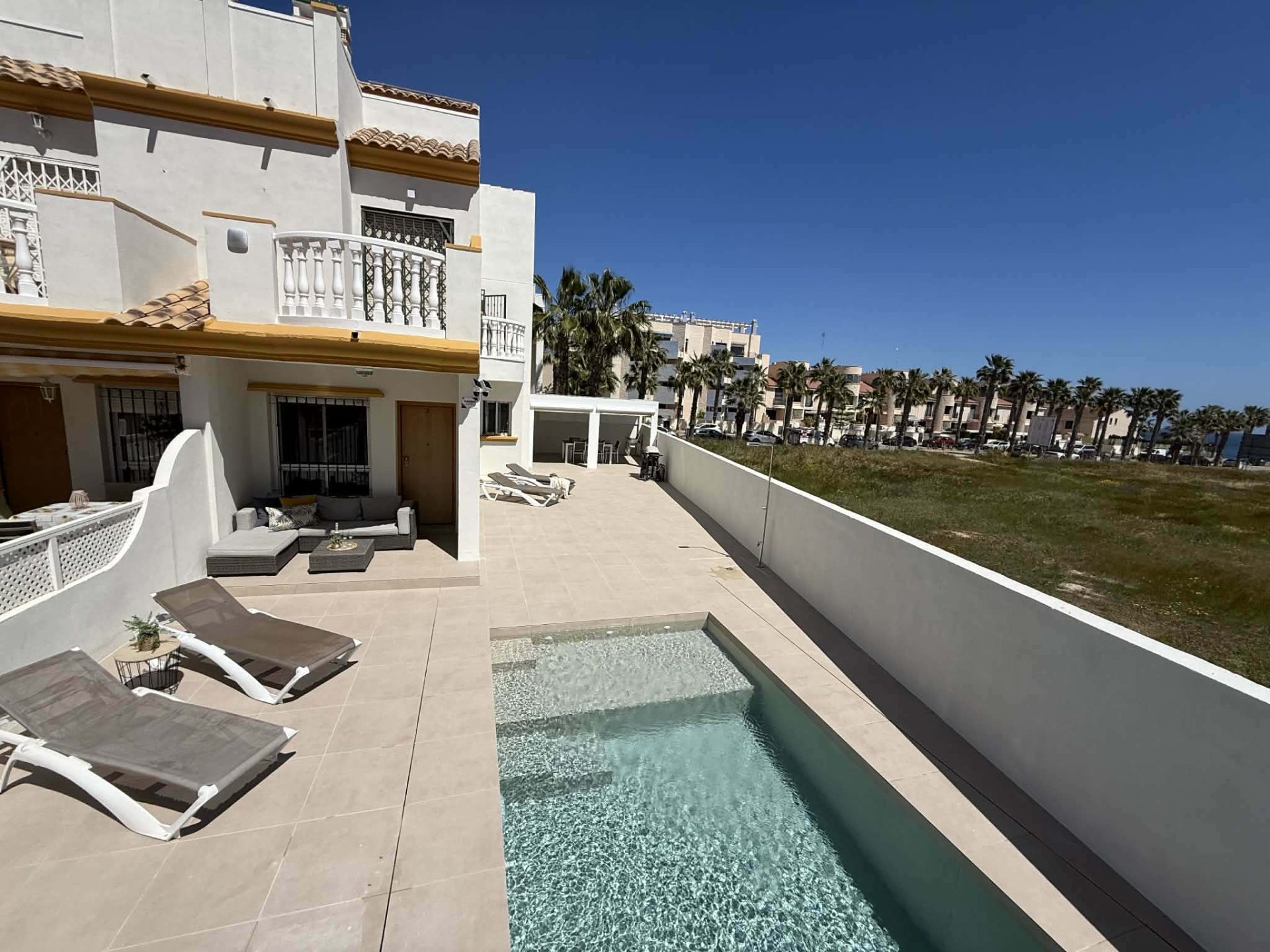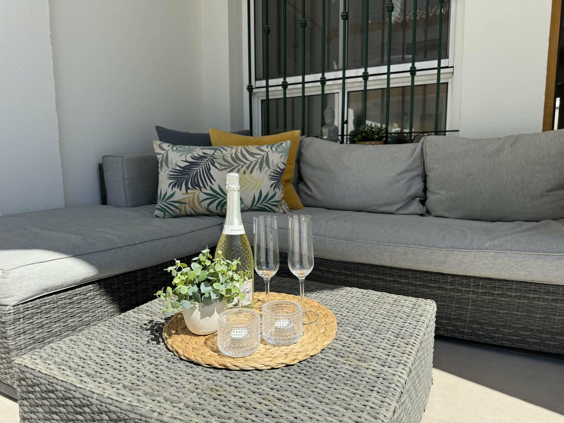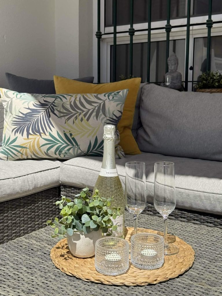 Þar er stækkanlegt borð, 8 stólar, 6 sólbekkir og frábær aðstaða til að njóta blíðunnar á Spáni, grilla góðan mat og sóla sig. Á annarri hæð eru suðursvalir út frá svefnherbergi með útsýni til sjávar og einnig litlar austursvalir með sjávarsýn frá ganginum.
