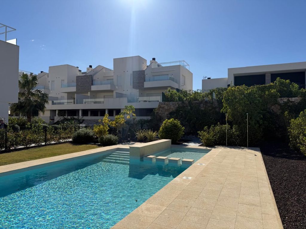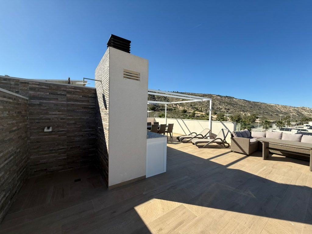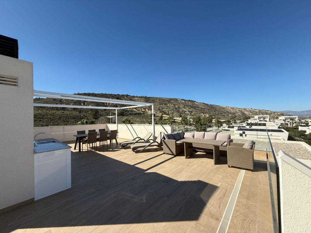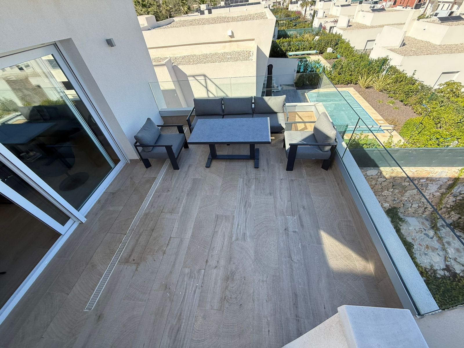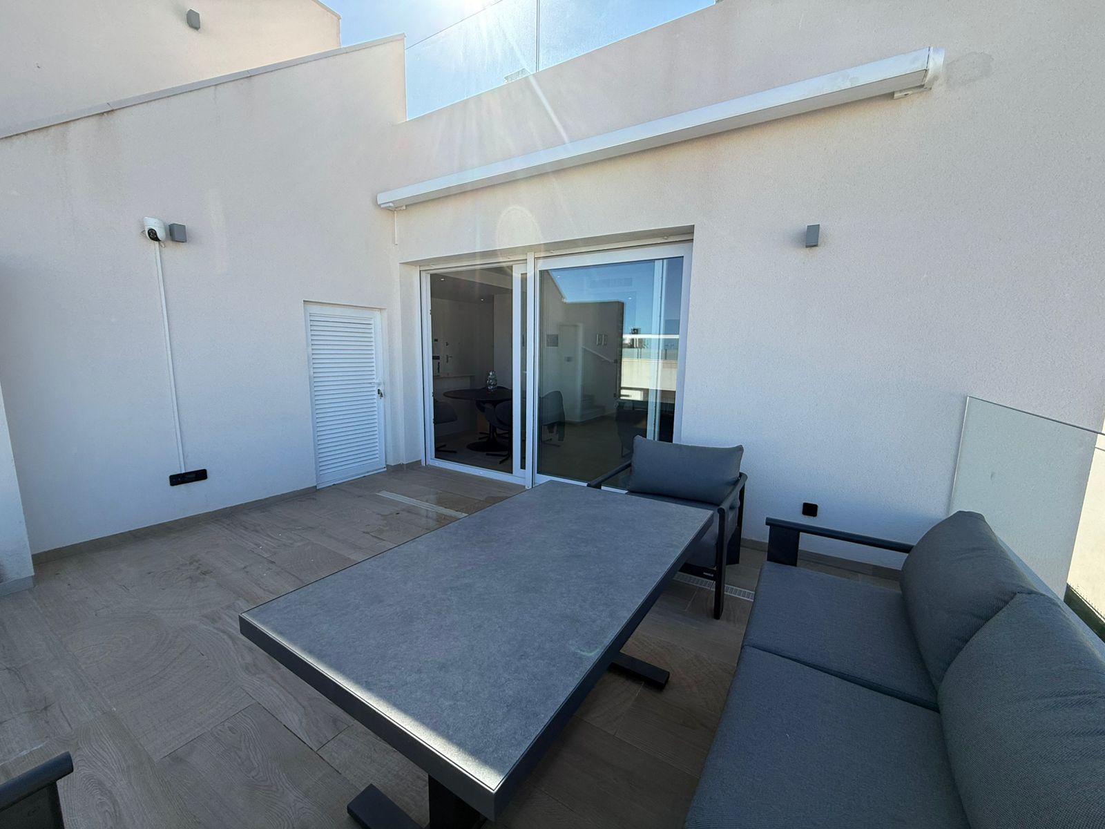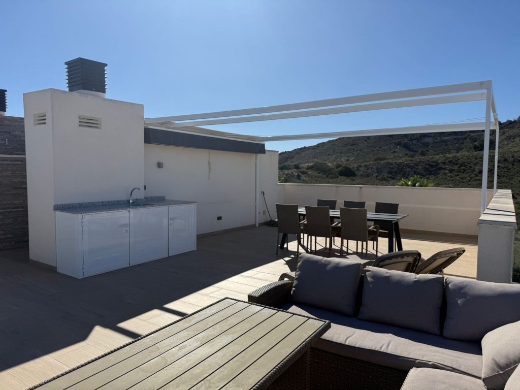 Fyrir stofunni eru rúmgóðar svalir með sófasetti og þaðan er síðan gengið uppá þaksvalir sem eru yfir allri íbúðinni. Á þaksvölum er frábær aðstaða fyrir gesti til að njóta blíðunnar á Spáni, grilla góðan mat og borða úti, þar er gott sófasett með borði, eldhús með ísskáp og vaski, gasgrill, sólbekkir, Pergola, útisturta og fallegt útsýni yfir garðinn og sundlaugina. Í sameign er sundlaugargarður með sundlaug, sólbekkjum, sturtum og opnu svæði. Þarna er einnig góð aðstaða til að sóla sig og slaka á við sundlaugarbakkann, garðurinn er einstaklega fallegur.
