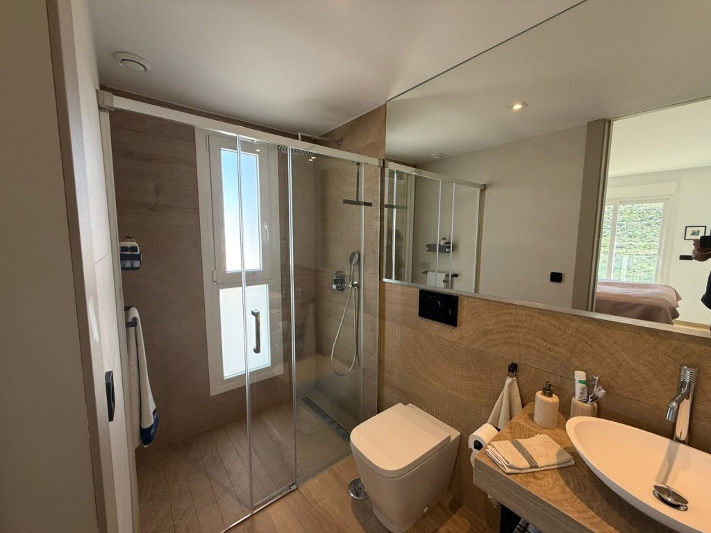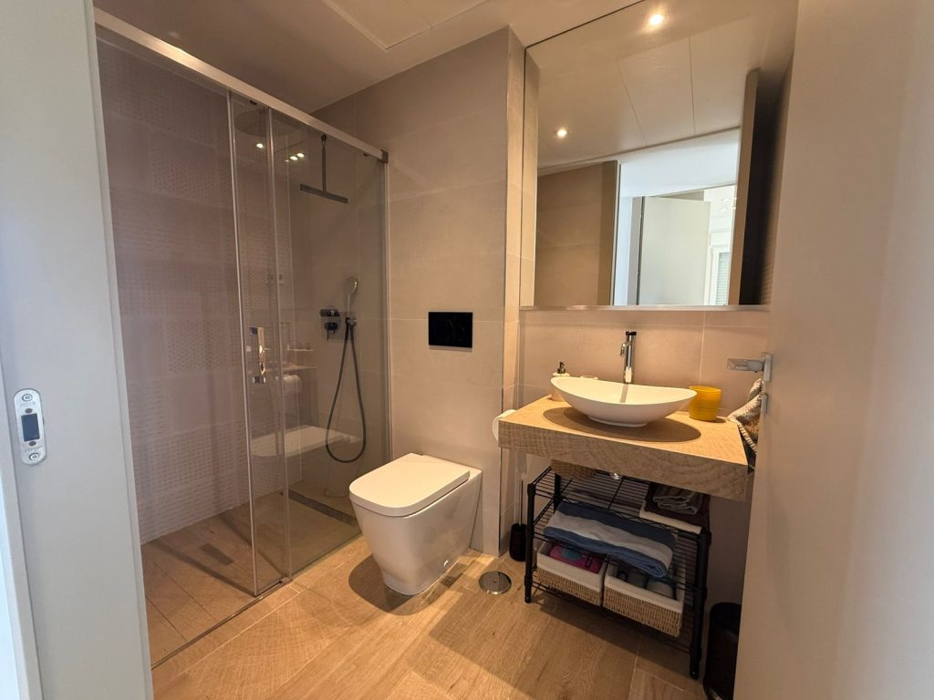 Innaf hjónaherbergi er baðherbergi með salerni, vaski, góðri sturtu og innréttingu með skúffum. Hitt baðherbergið er á herbergisgangi, þar er salerni, vaskur, góð sturta og innrétting með skúffum. Baðhandklæði fylgja fyrir gesti og hárblásari er í íbúðinni. Gestir eru beðnir um að koma með sín eigin strandhandkæði til að taka með á ströndina.