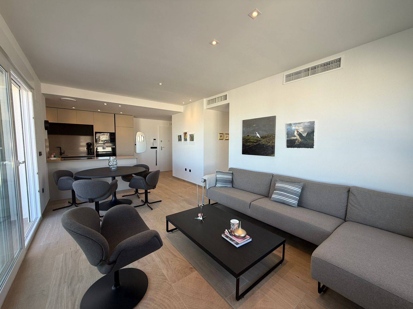 Eldhúsið er bjart og vel búið með öllum helstu áhöldum til matargerðar. Falleg björt stofa með borðstofu og opið er inní eldhúsið, í stofunni er sófi, borðstofusett og sjónvarp. Frá stofunni er rennihurð út á svalirnar með sófasetti og gott útsýni yfir garðinn og að sundlauginni.
