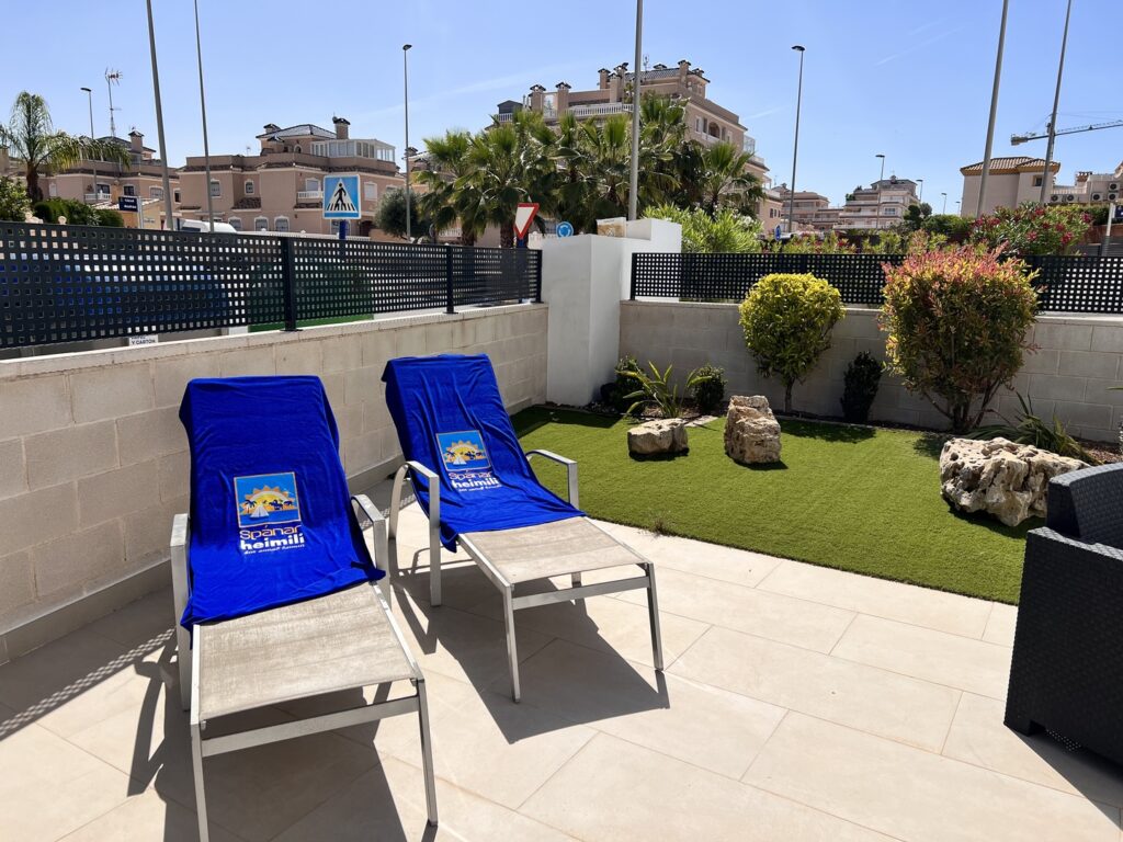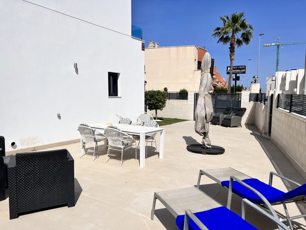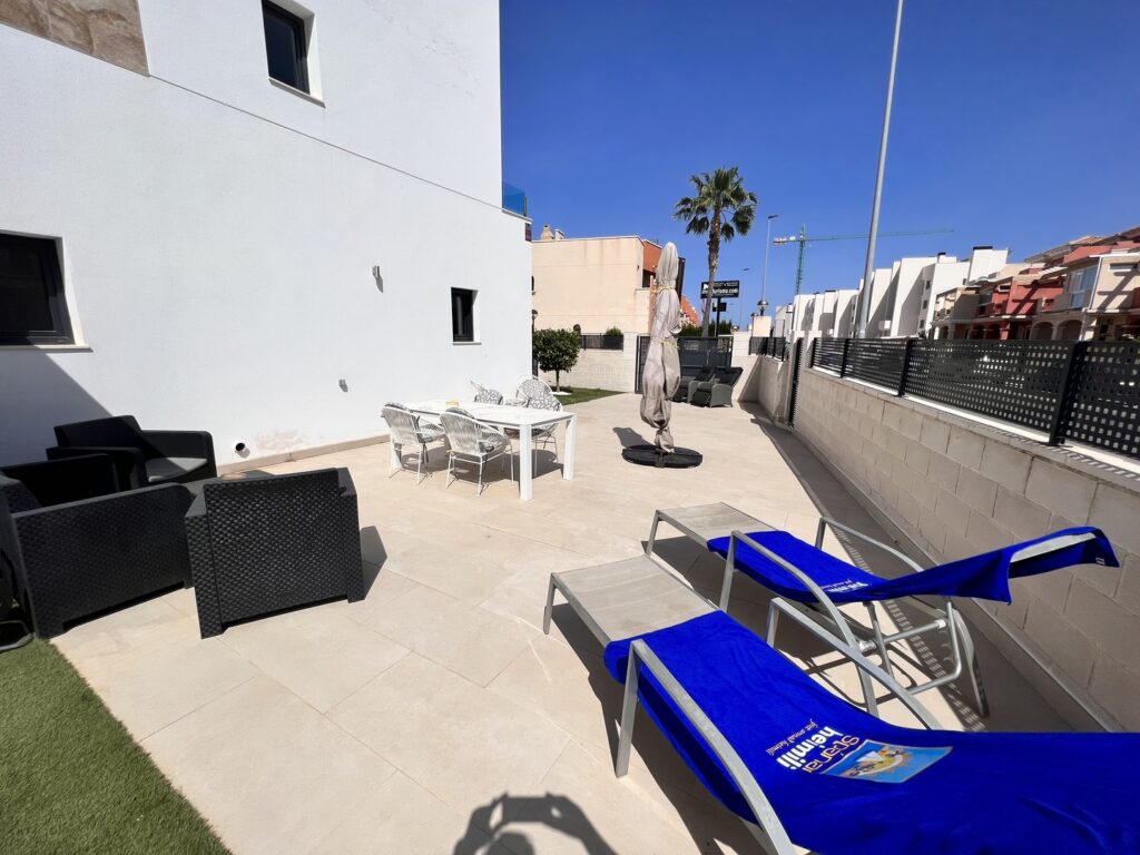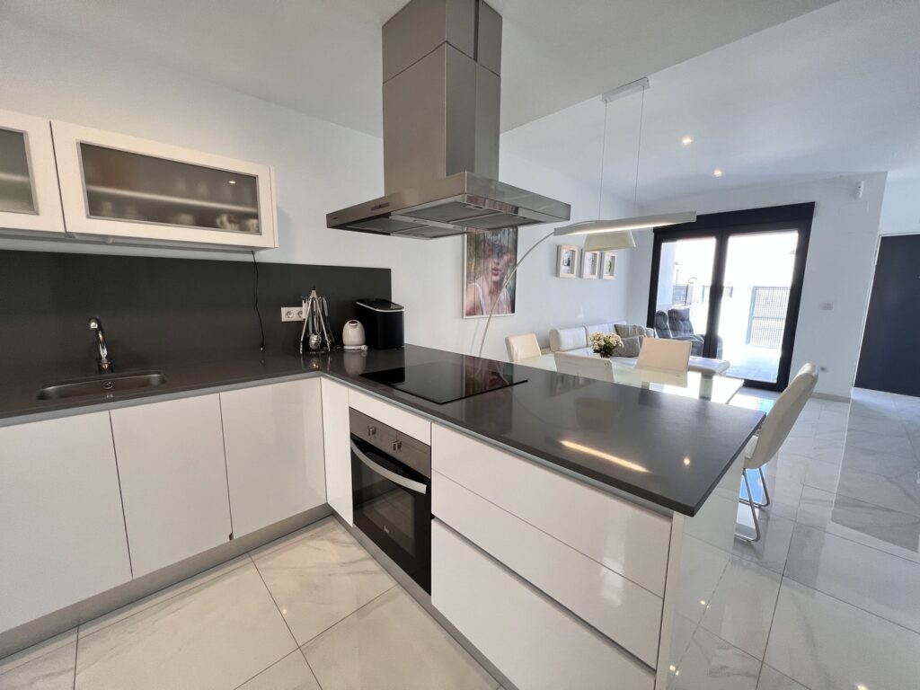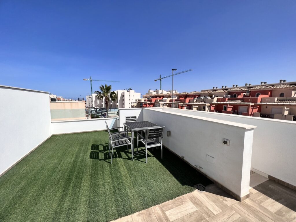 Glæsilegt endaraðhús í Villamartin hverfinu sem er í lokuðum kjarna með aðgengi að tveimur sundlaugum og er önnur þeirra upphituð. Allur frágangur þessar eignar er til fyrirmyndar með upphituð gólf á baðherbergjum, rafmagnsgardínur og loftkælingu sem hitar líka loftið. Á jarðhæð er stórt og flott eldhús með öllu tilheyrandi til matargerðar, einnig er flott kaffibaunavél, klakavél og stór drykkja kælir. Opið til stofu og borðstofu. Mjög stór garður er við húsið og þar er sól allan daginn með vönduðum úthúsgögn og Weber rafmagnsgrilli, einnig eru rúmgóðar þaksvalir.