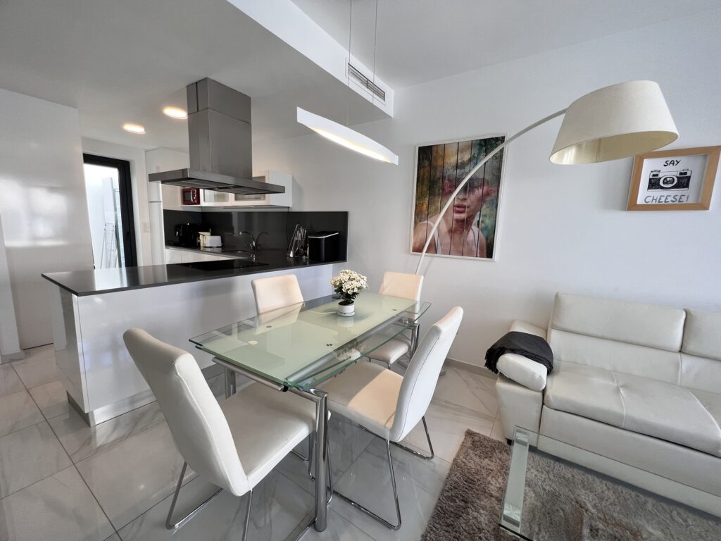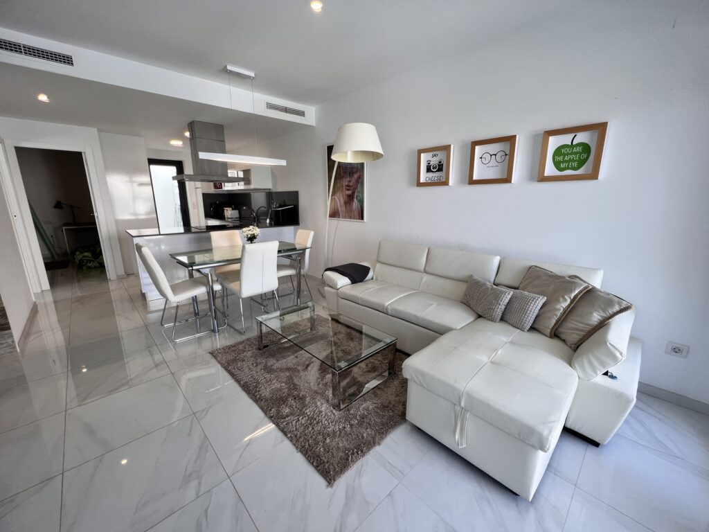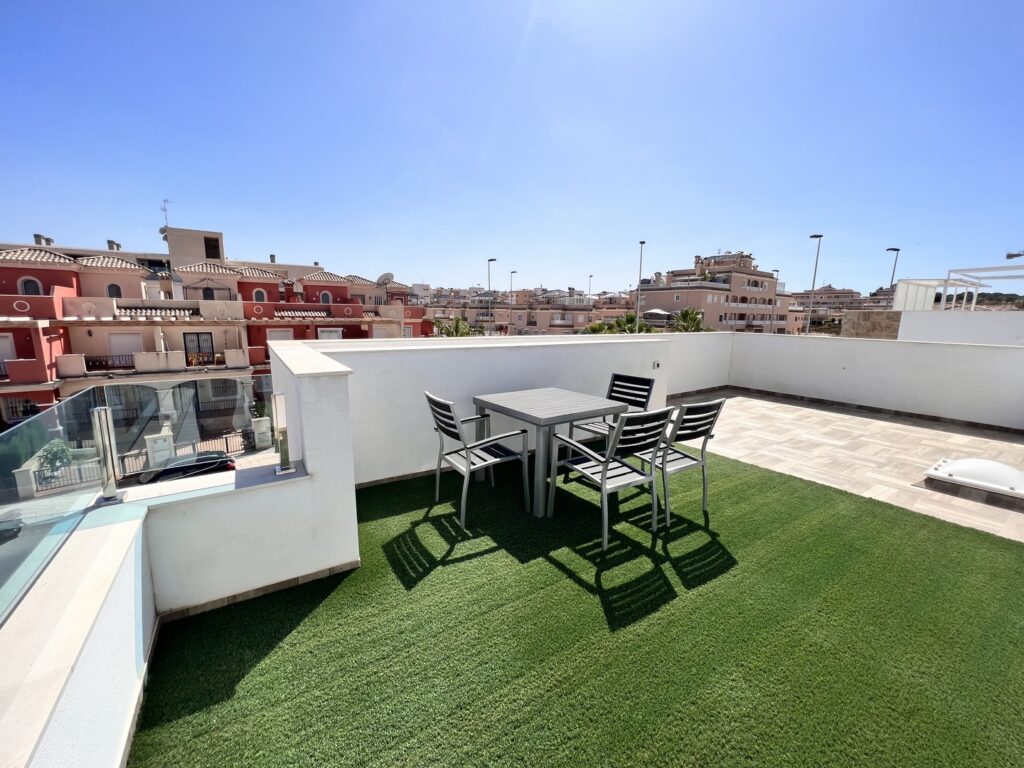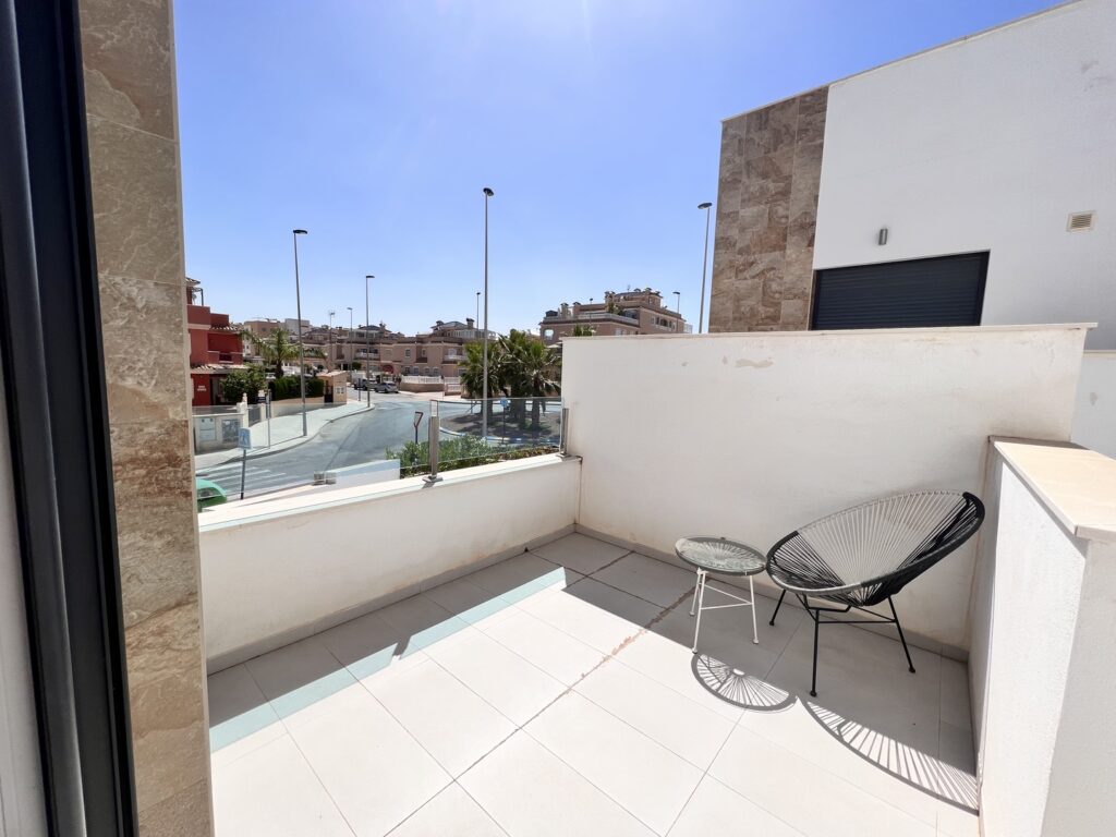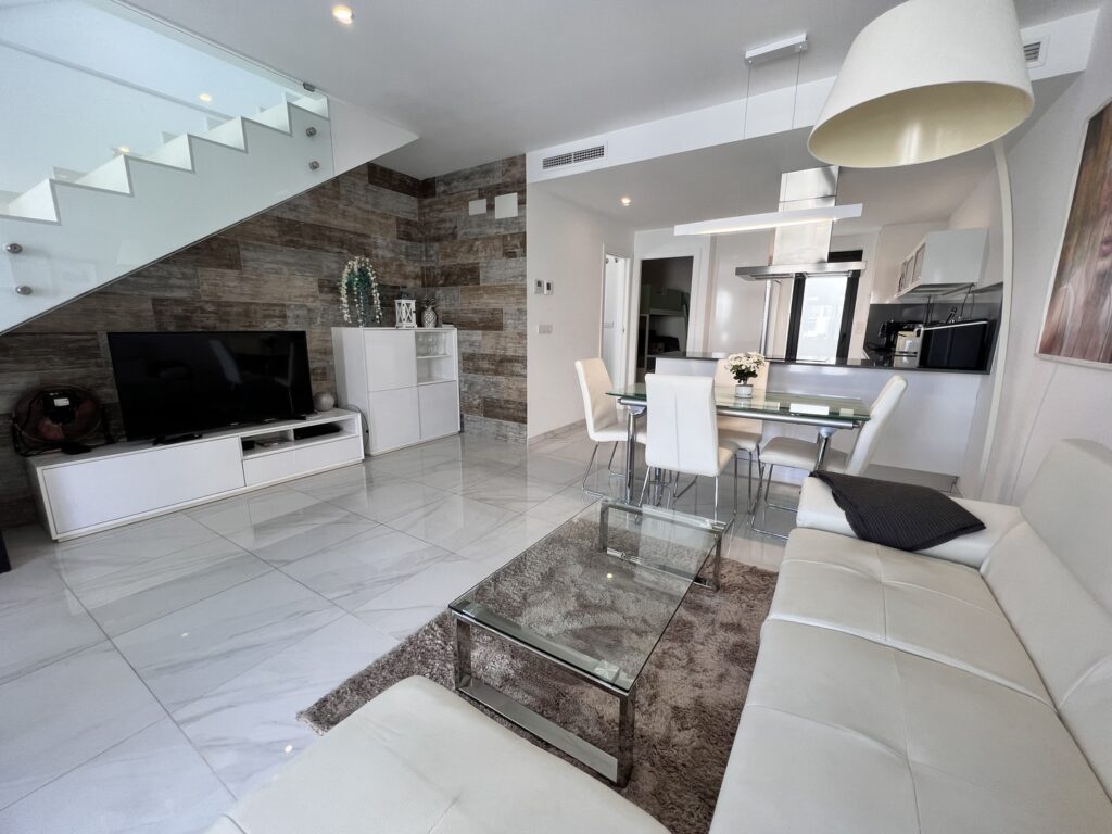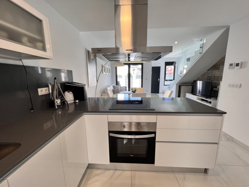 Glæsilegt endaraðhús í Villamartin hverfinu sem er í lokuðum kjarna með aðgengi að tveimur sundlaugum og er önnur þeirra upphituð. Allur frágangur þessar eignar er til fyrirmyndar með upphituð gólf á baðherbergjum, rafmagnsgardínur og loftkælingu sem hitar líka loftið. Á jarðhæð er stórt og flott eldhús með öllu tilheyrandi til matargerðar, einnig er flott kaffibaunavél, klakavél og stór drykkja kælir. Opið til stofu og borðstofu. Mjög stór garður er við húsið og þar er sól allan daginn með vönduðum úthúsgögn og Weber rafmagnsgrilli, einnig eru rúmgóðar þaksvalir.