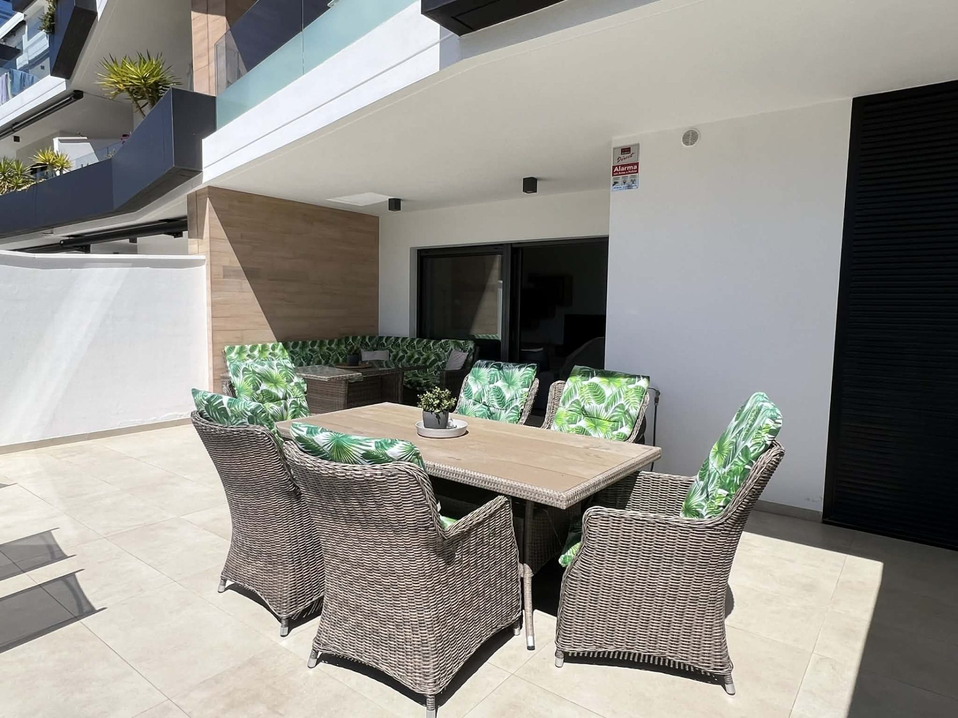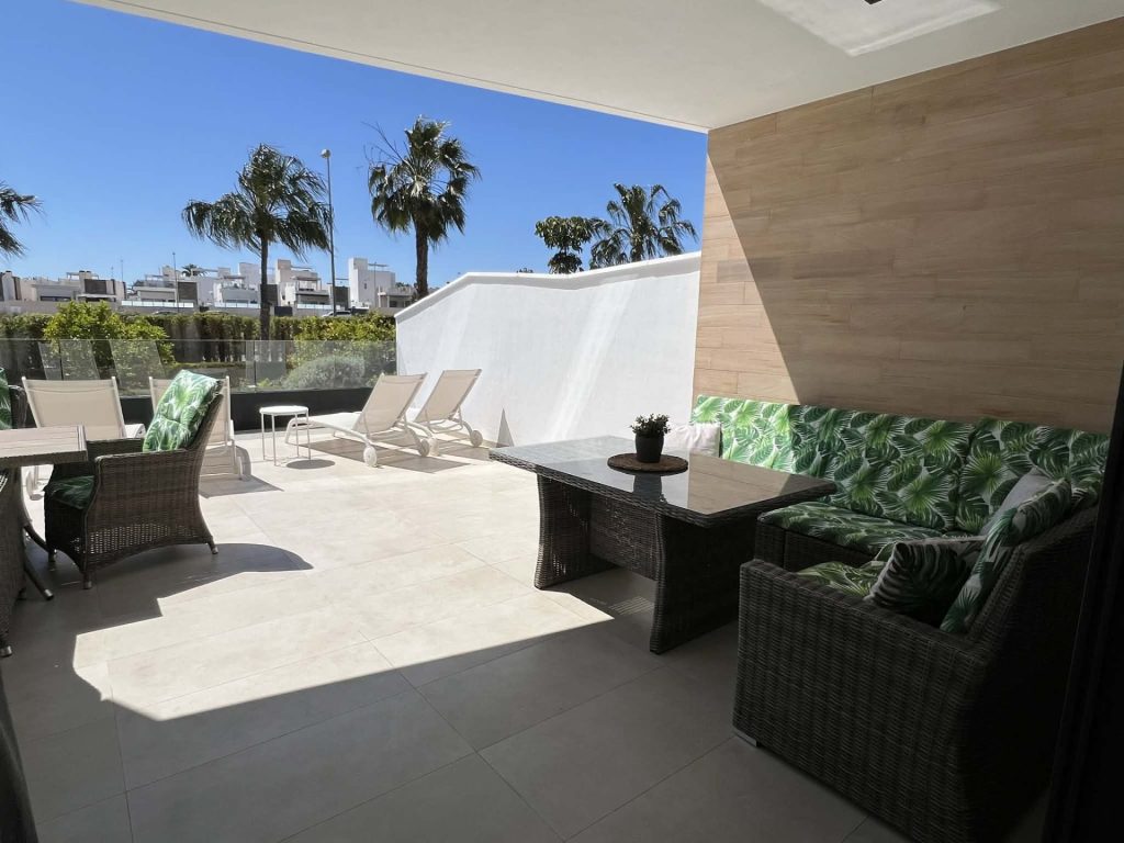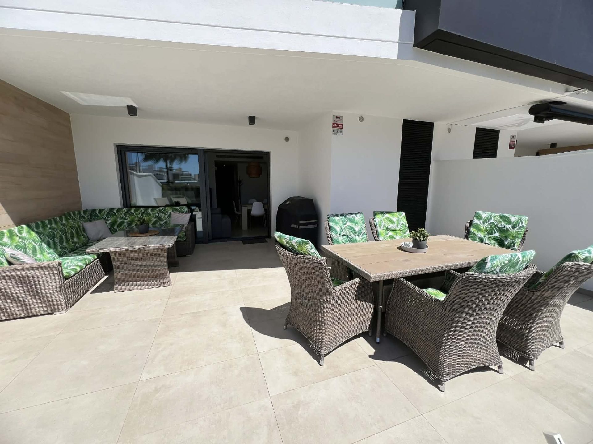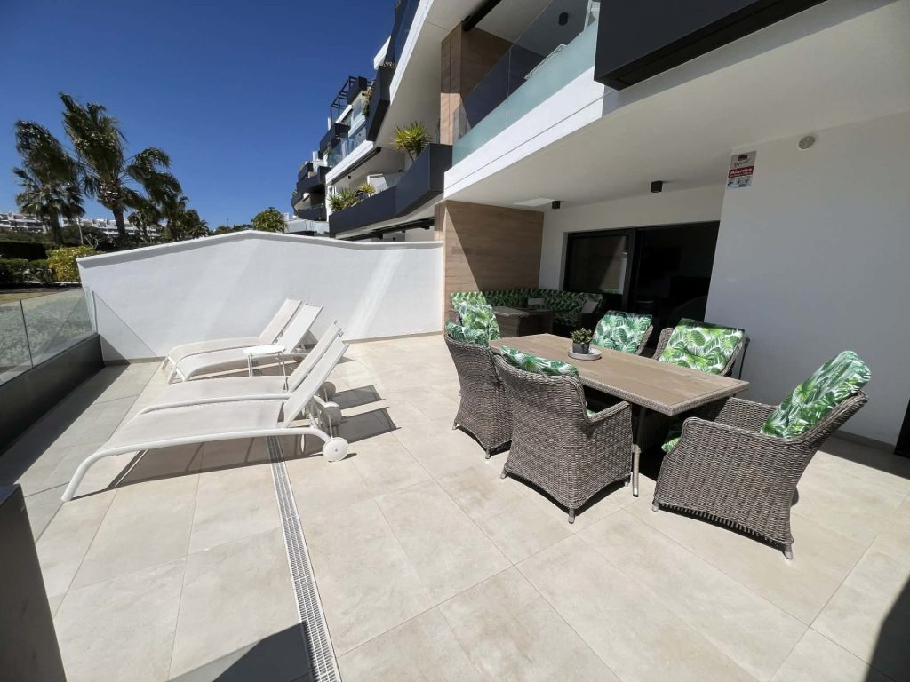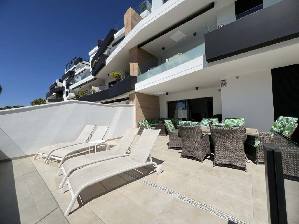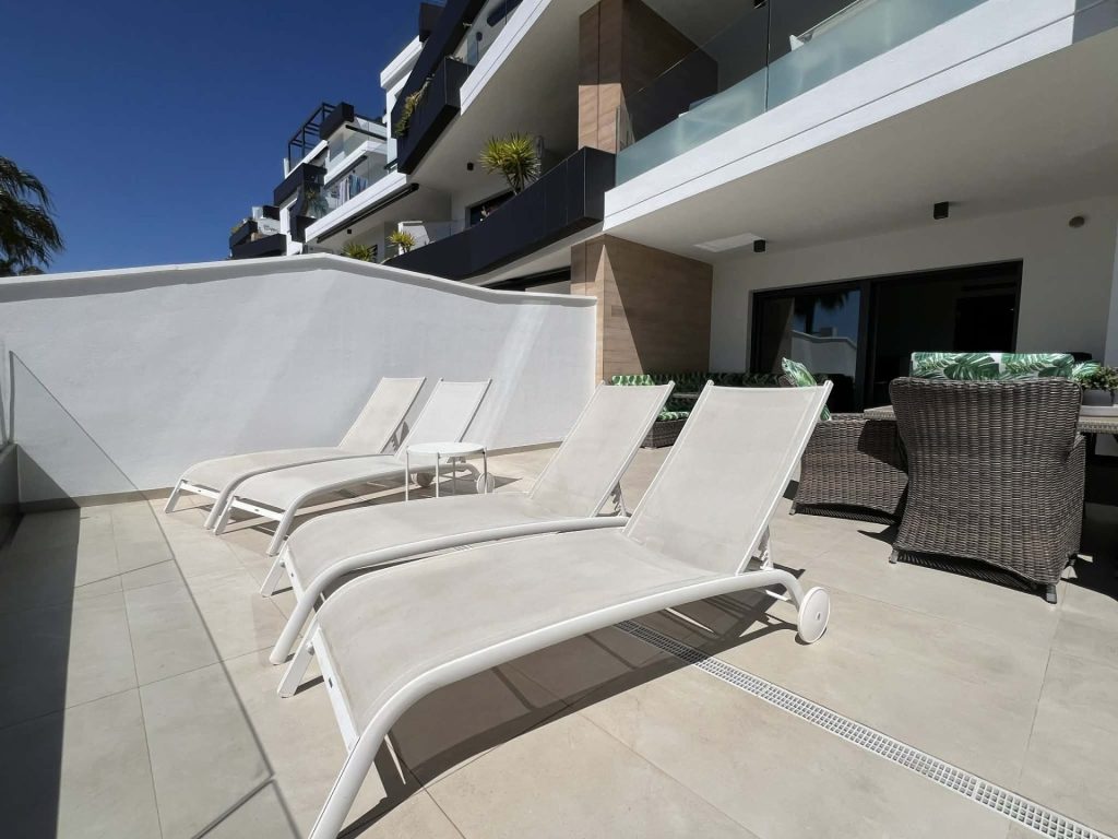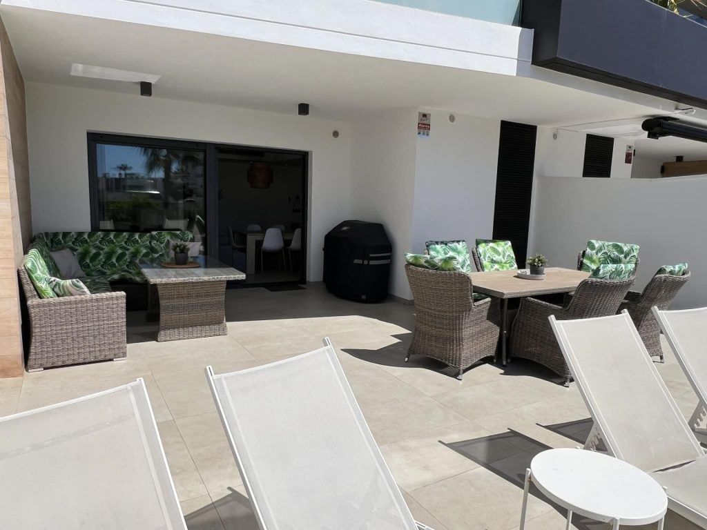 Frá stofu eru rennihurðar sem opna út á flísalagða verönd, þar eru sólbekkir, borð, stólar, Weber gasgrill og sófasett. Þarna er frábær aðstaða fyrir gesti til að borða úti og njóta blíðunnar. Veröndin snýr í suðurátt og því ekki þörf á að fara út fyrir svalirnar til þess að njóta sólarinnar.
