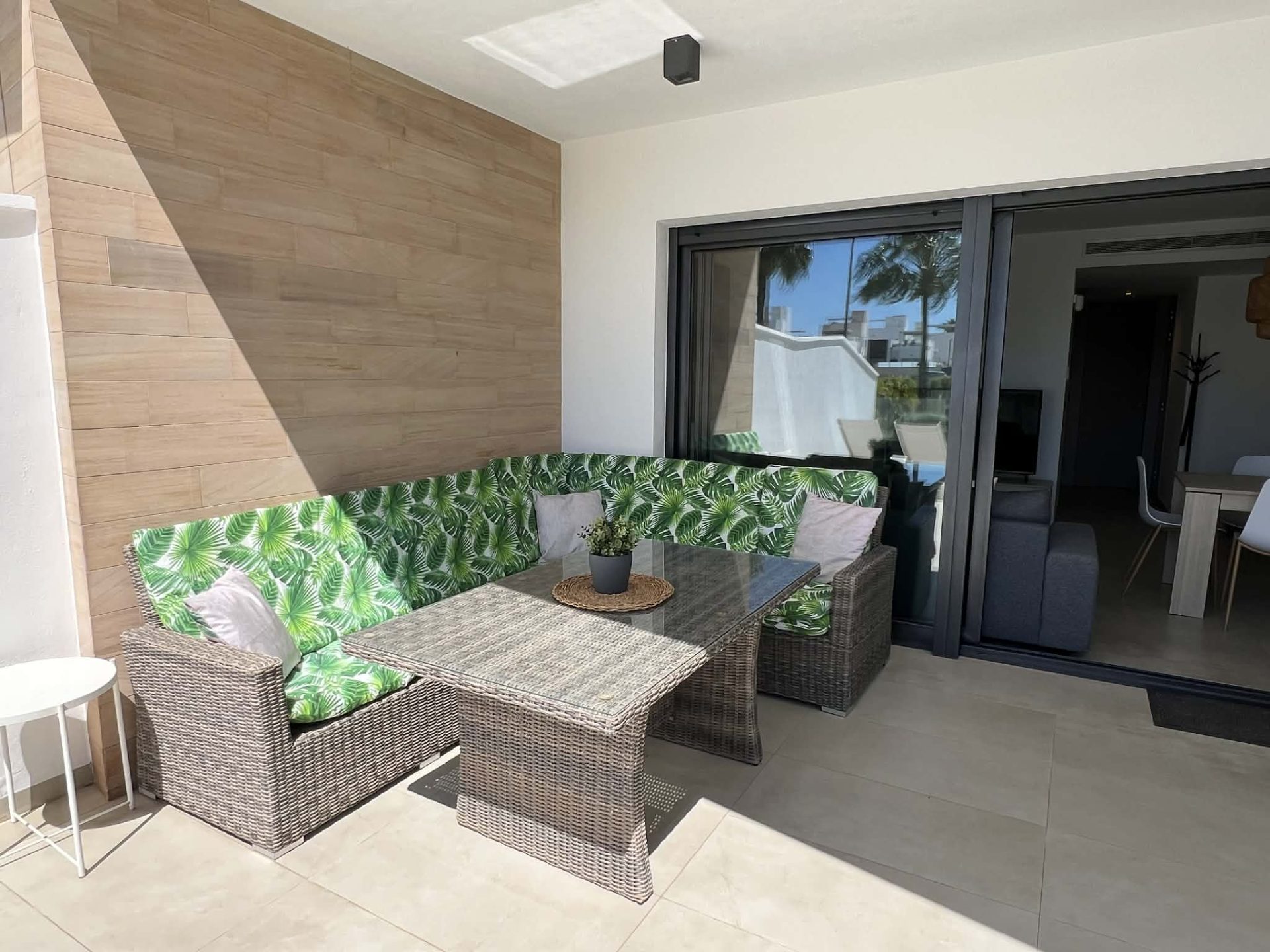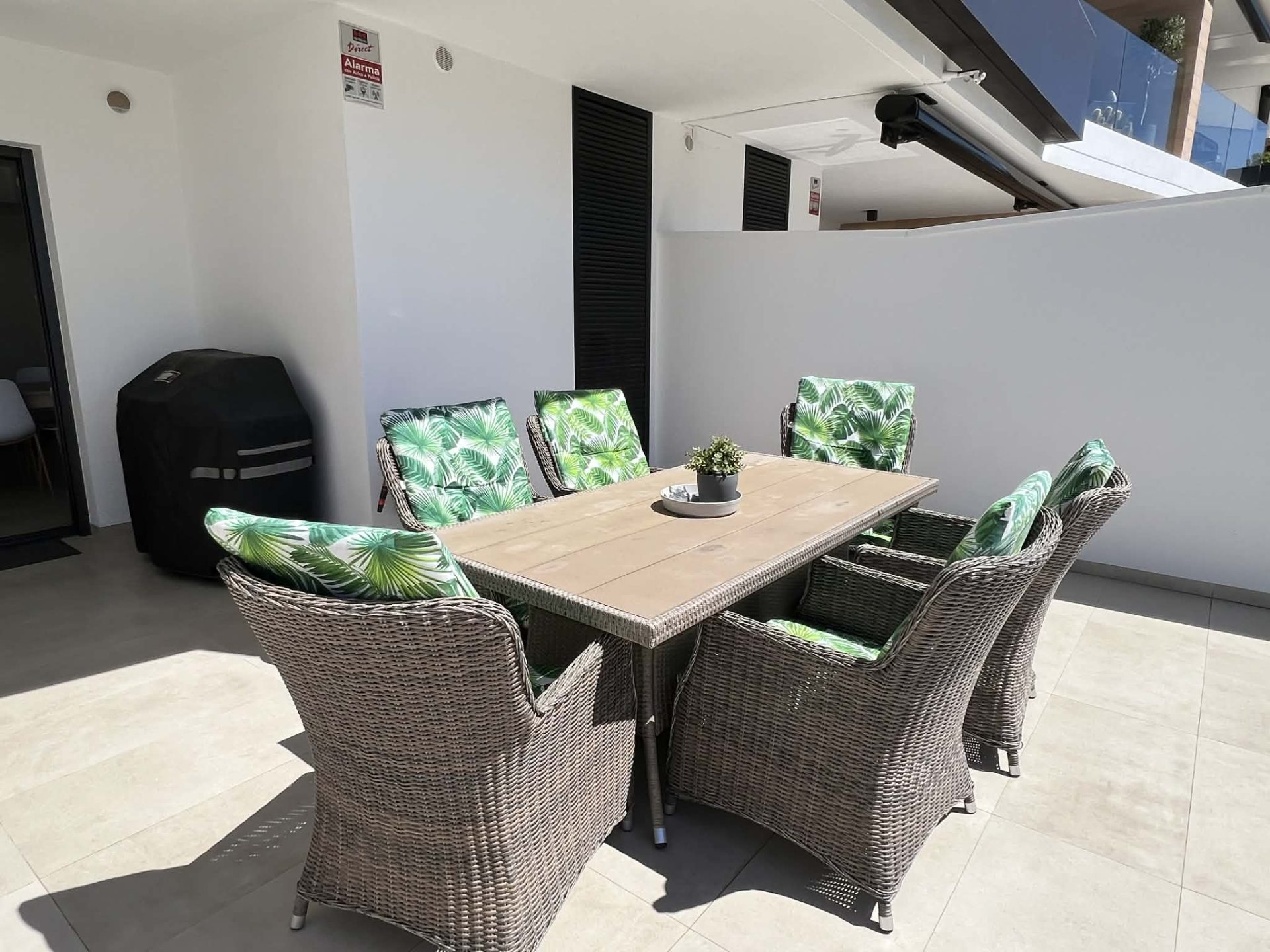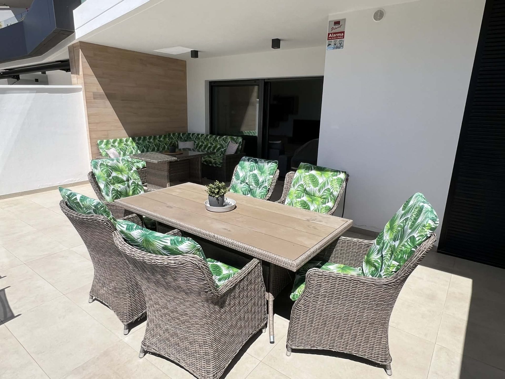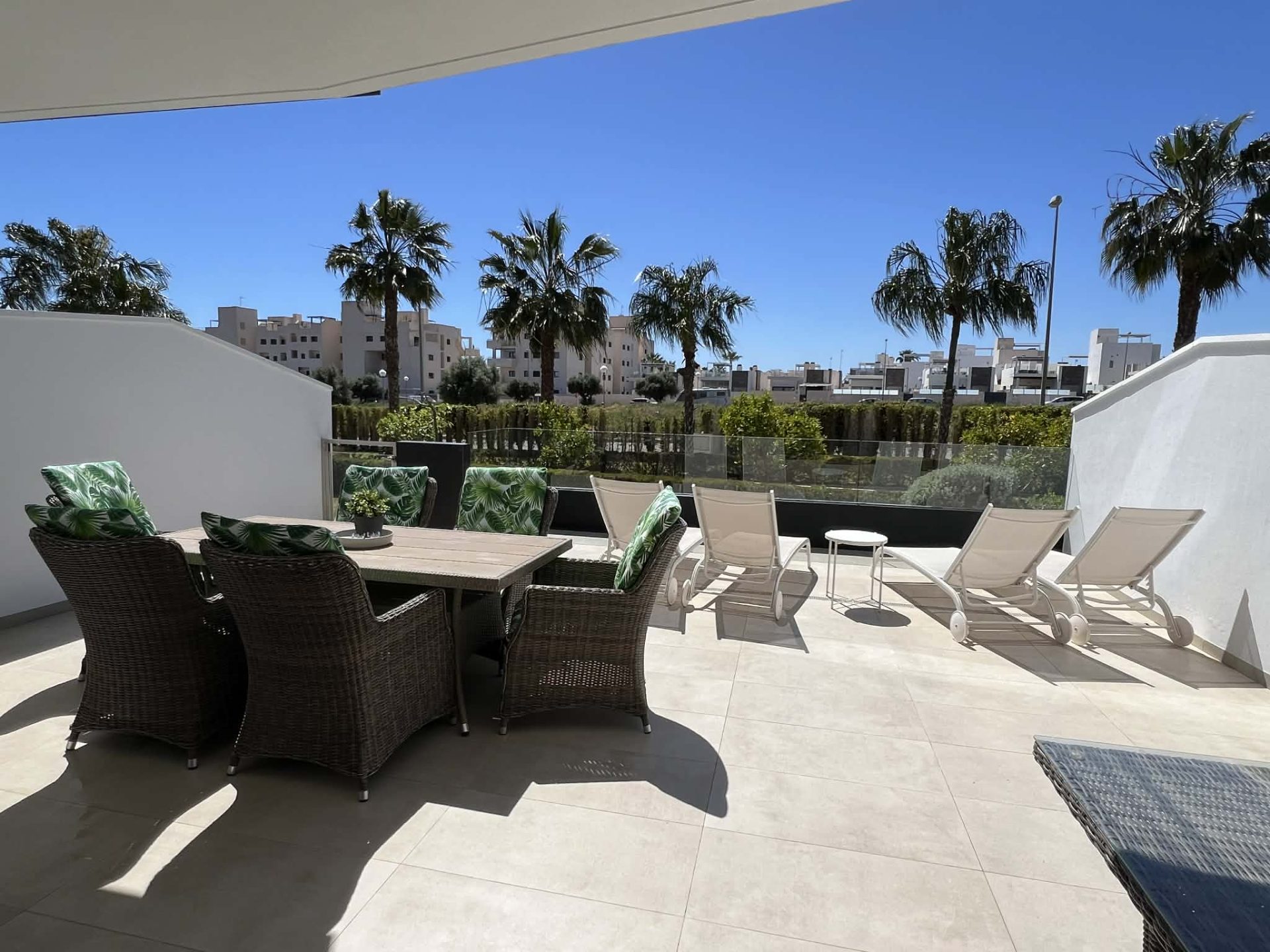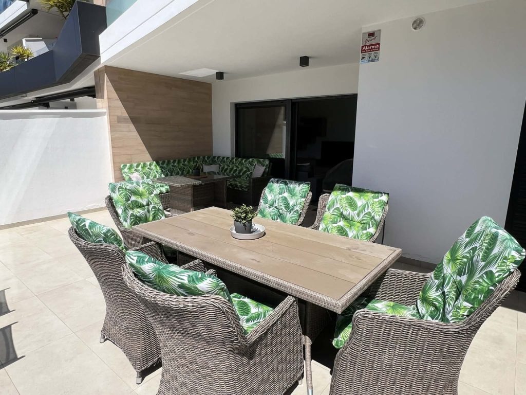 Frá stofu eru rennihurðar sem opna út á flísalagða verönd, þar eru sólbekkir, borð, stólar, Weber gasgrill og sófasett. Þarna er frábær aðstaða fyrir gesti til að borða úti og njóta blíðunnar. Veröndin snýr í suðurátt og því ekki þörf á að fara út fyrir svalirnar til þess að njóta sólarinnar.