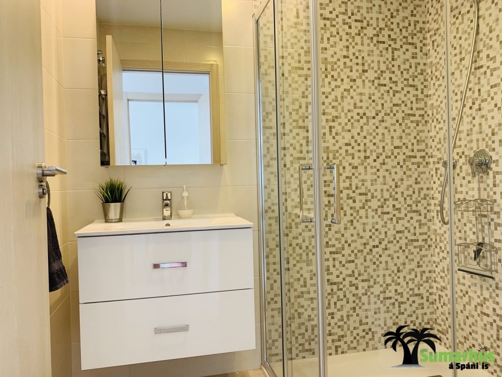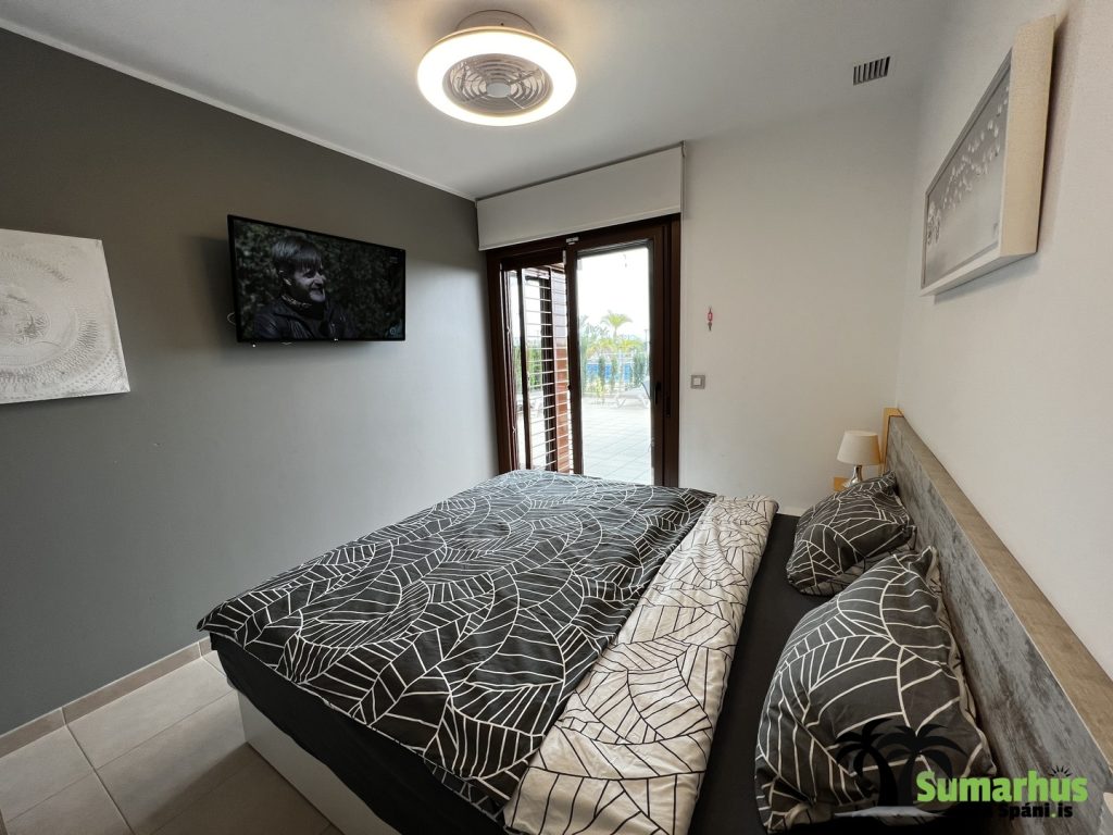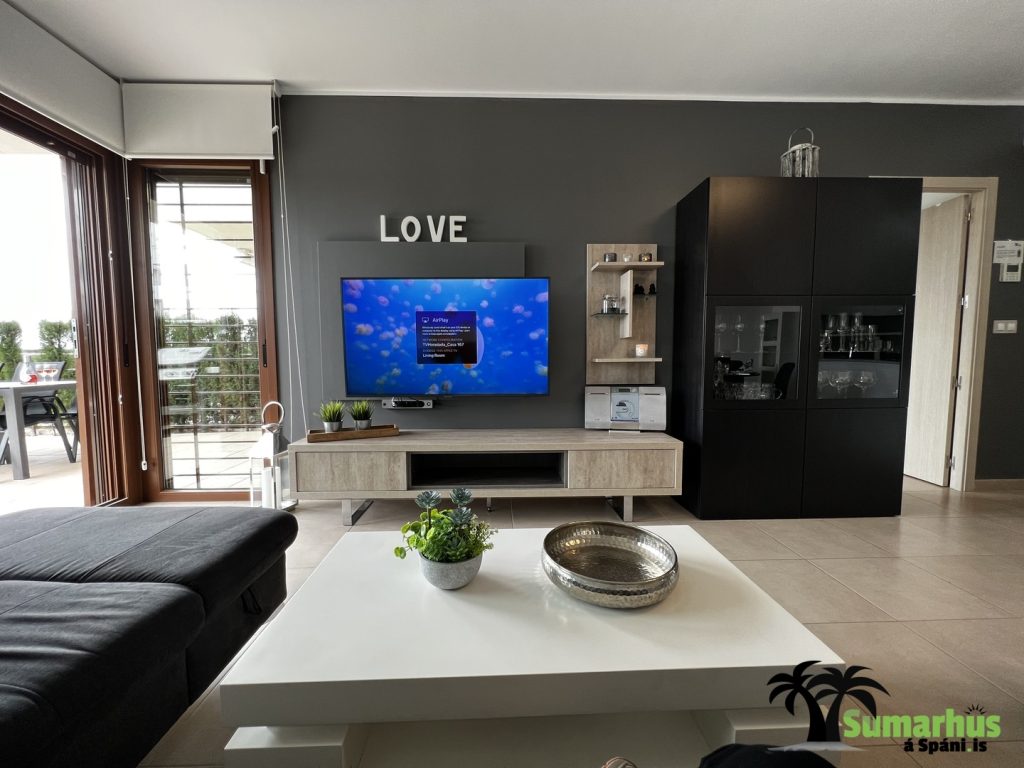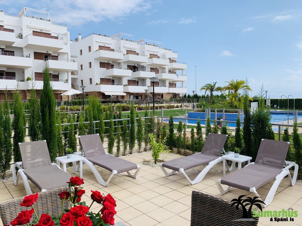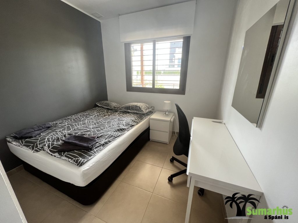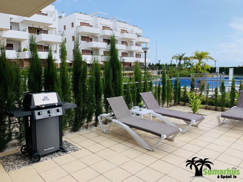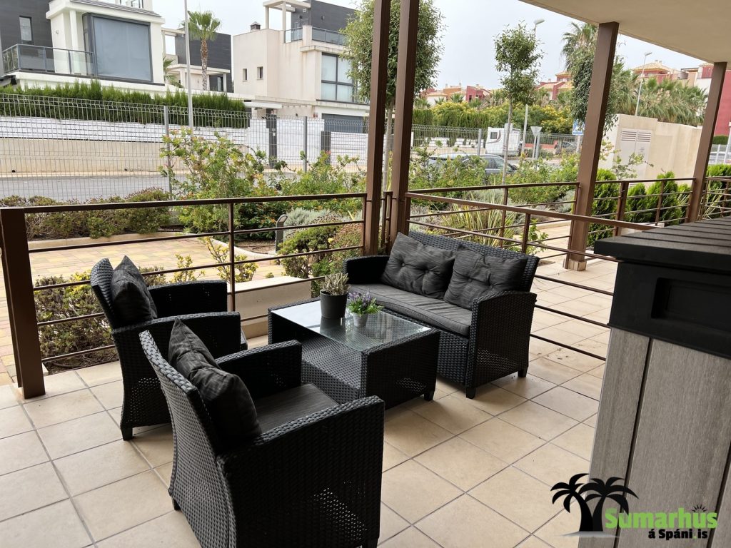 Íbúðin er á jarðhæð í glænýjum íbúðarkjarna í Lomas de Cabo Roig hverfinu og er mjög vel búin, WiFi, gasgrill, loftkæling og allt til alls. Rúmgóðar verandir eru fyrir framan og aftan íbúðina. Þrír fallegir sundlaugargarðar eru inná milli húsana og hafa gestir aðgang að þeim öllum, hverfið er mjög rólegt og gott. Veitingastaðir eru í göngufæri og stutt að skreppa á ströndina, á fimmtudagsmarkaðinn, í La Zenia mallið og niður á göngugötuna í Cabo Roig.