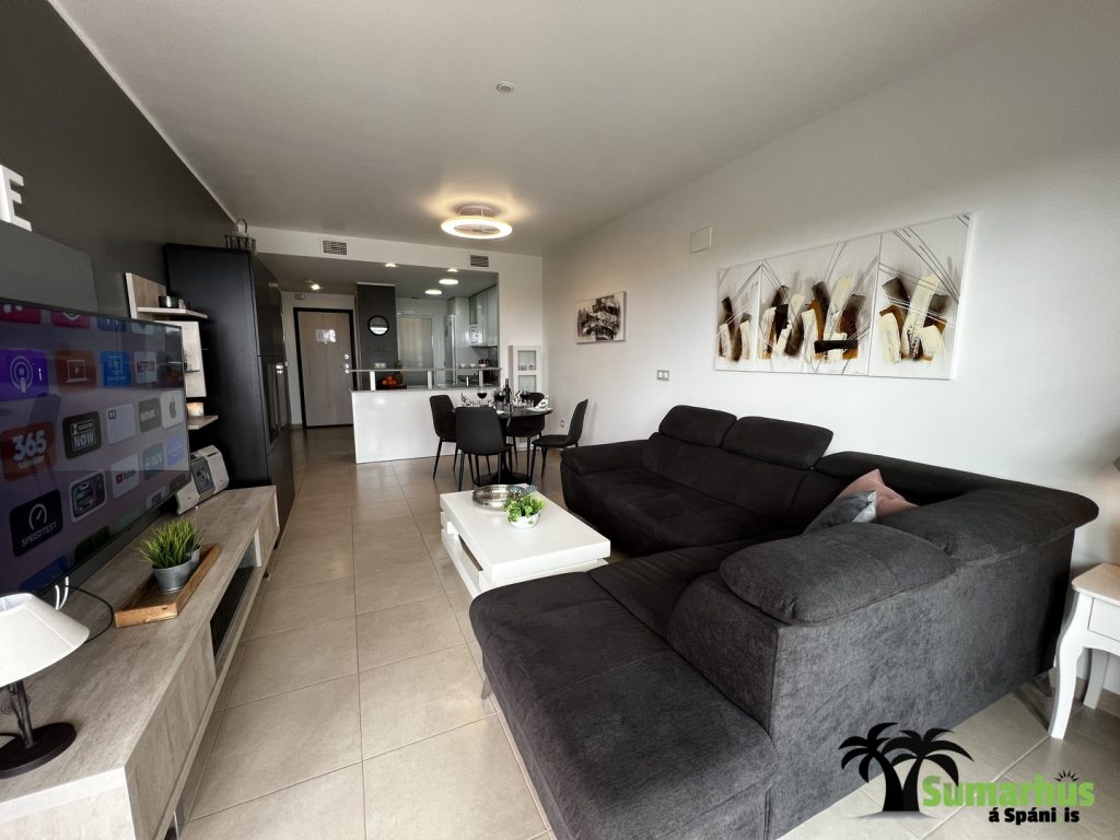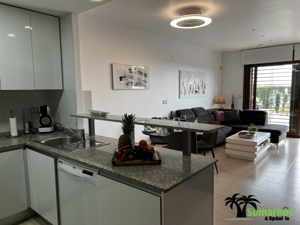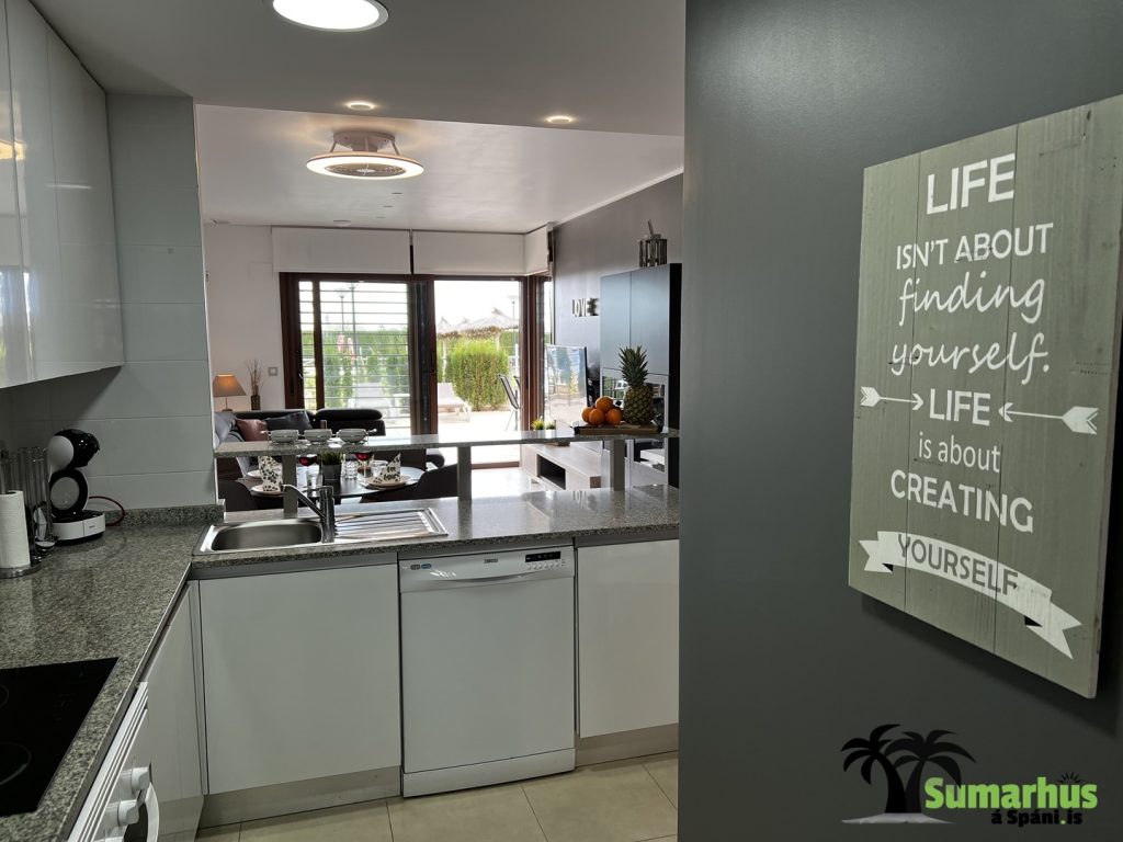 Við aðalinngang er flísalögð verönd með fallegum húsgögnum og þaðan er gengið beint inn í opið rými með fallegri stofu sem einnig er borðstofa og opið er inní eldhúsið. Í stofunni er góður sófi sem einnig er svefnsófi, Smart TV, loftkæling og moskitó net í hurð svo hægt er að hafa opið út án þess að fá flugur inn. Eldhúsið er bjart og vel búið og þaðan er síðan þvottahús/geymsla. Í eldhúsinu er stór ísskápur með góðu frystihólfi, uppþvottavél, kaffivél, brauðrist, samlokugrill, hraðsuðuketill og öll helstu áhöld til matargerðar.
