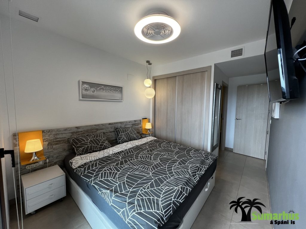 Hjónherbergið er með hjónarúmi og góðum fataskápum og innangent er inná baðherbergi sem er með sturtu. Einnig er gott sjónvarp uppá vegg í hjónaherberginu.