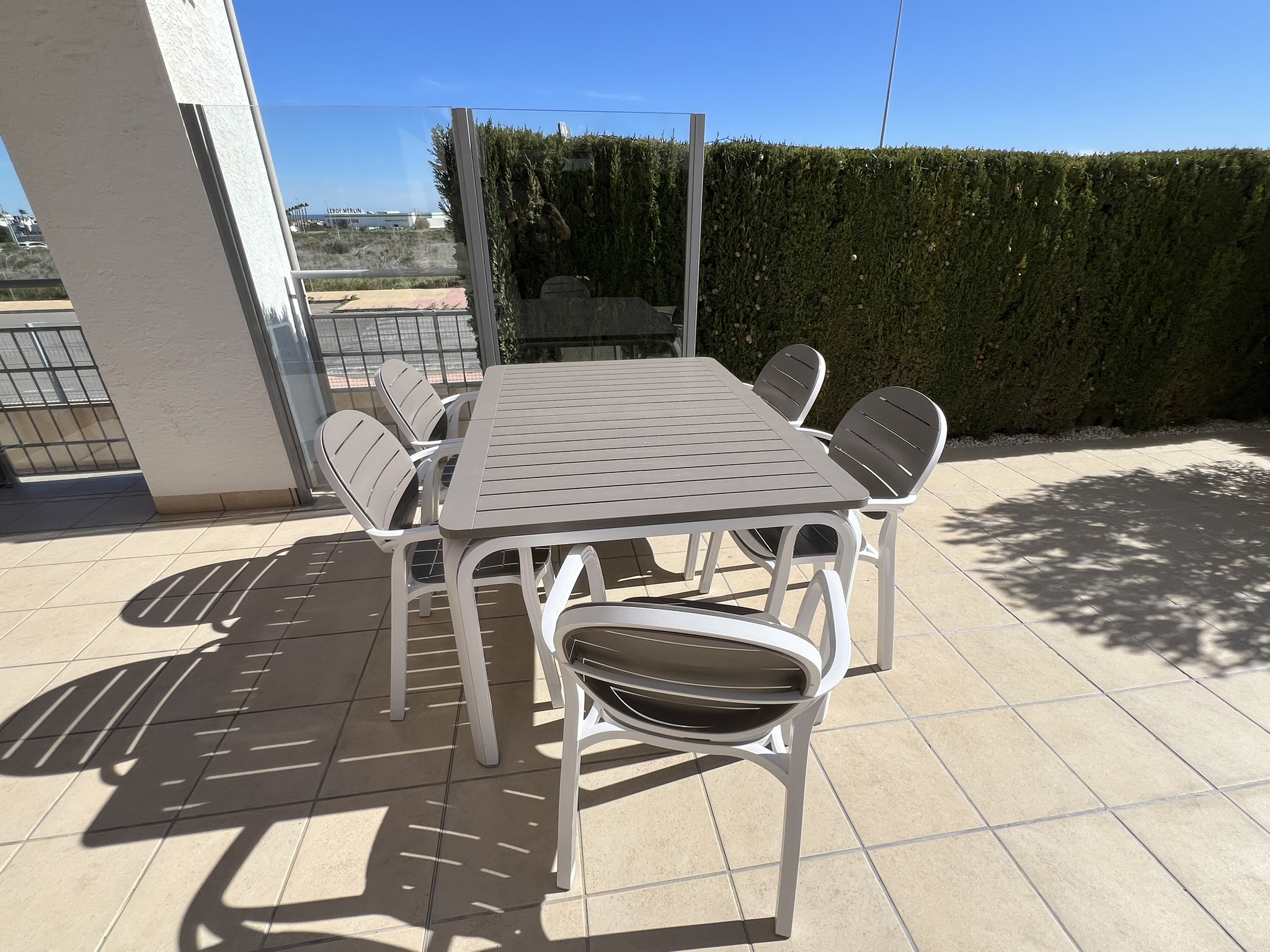 Gengið er út úr stofunni á fallega verönd sem snýr í suður, einnig eru borð og 4 stólar á veröndinni sem snýr að sundlauginni. Þarna er frábær aðstaða fyrir gesti til að borða úti og njóta.