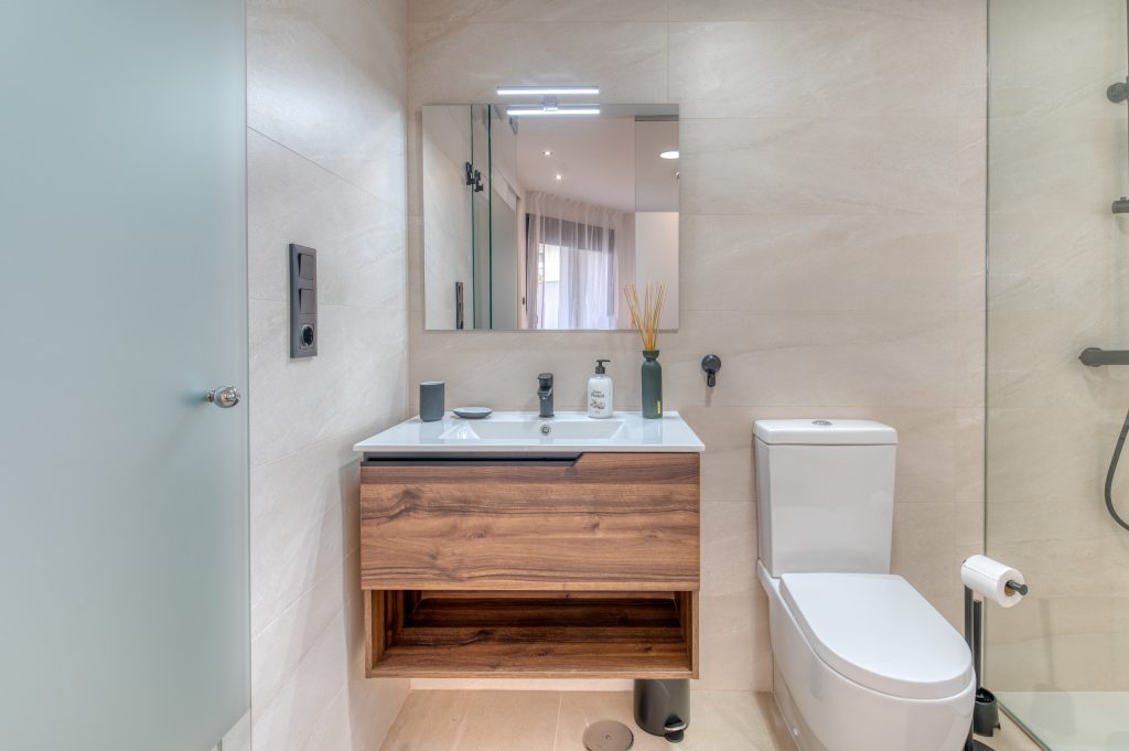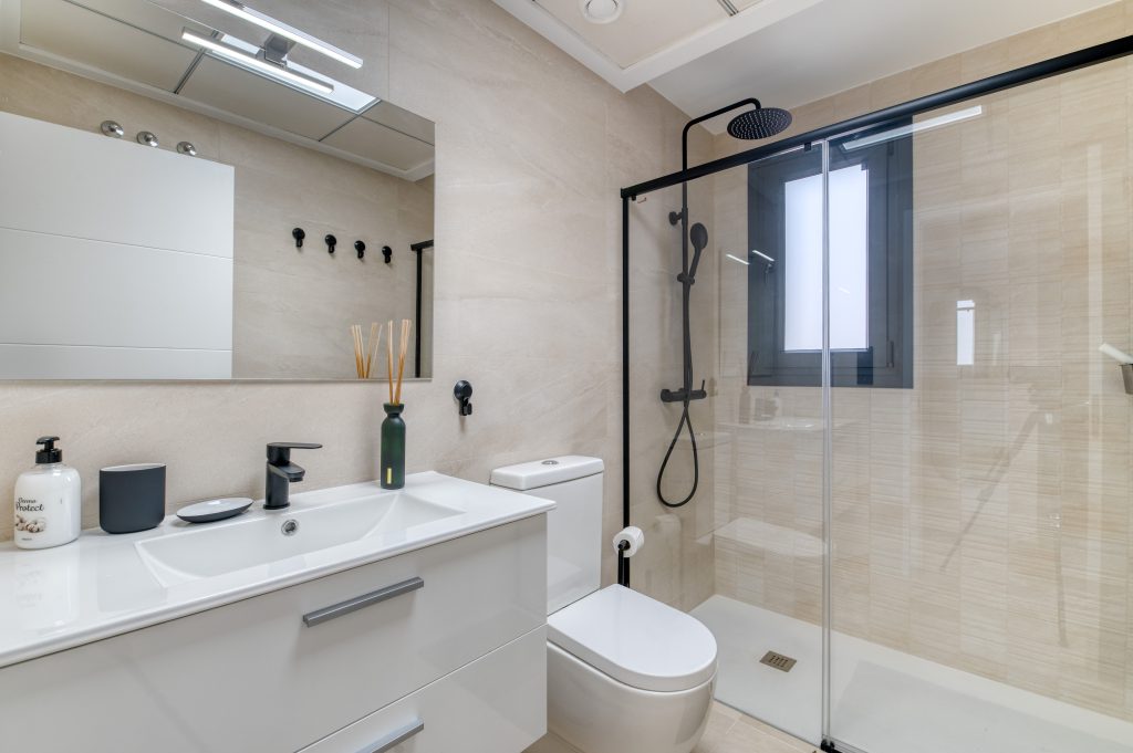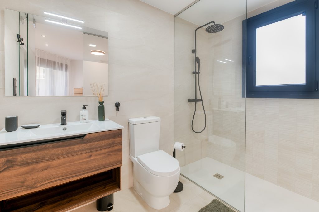 Tvö falleg baðherbergi eru í íbúðinni, annað er innaf hjónaherbergi. Þau eru bæði rúmgóð með salerni, vaski, sturtu og innréttingu. Baðhandklæði fylgja leigu fyrir gesti. Gestir eru þó beðnir um að koma með sín eigin handkæði til sólbaða og til að nota í garðinum og á ströndina.