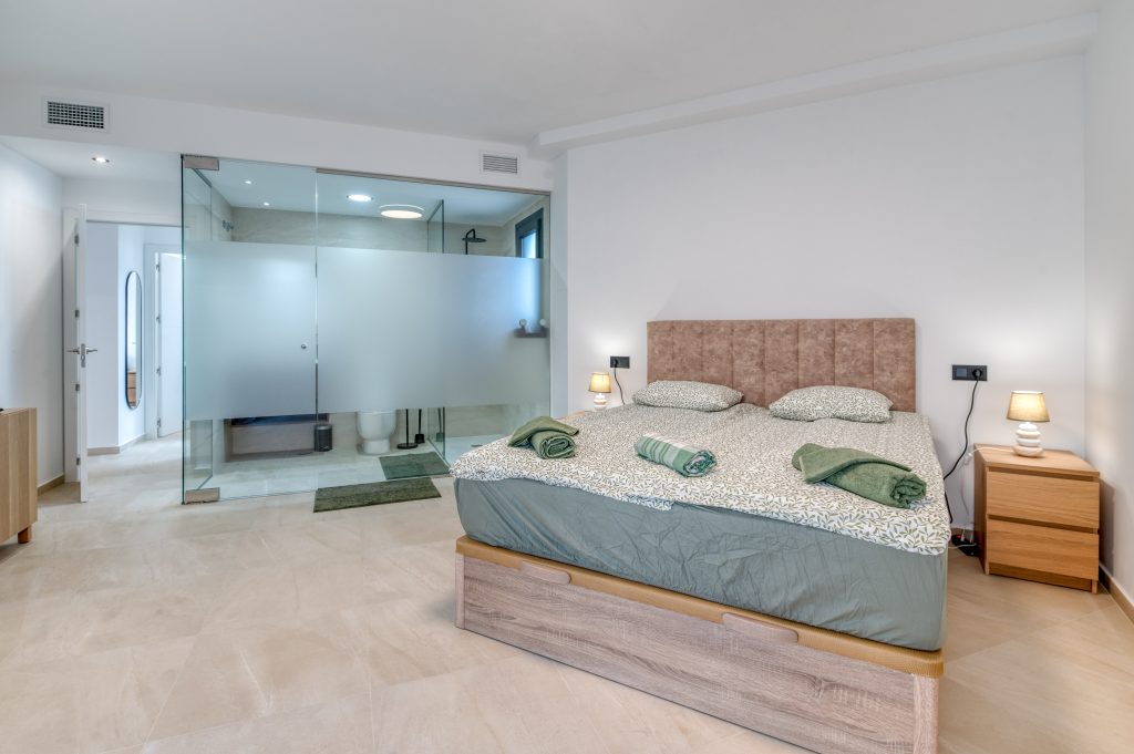 Hjónherbergið er mjög rúmgott með 160x200 hjónarúmi, góðum fataskápum og loftkælingu, inn af hjónaherberginu er gott baðherbergi með sturtu.
